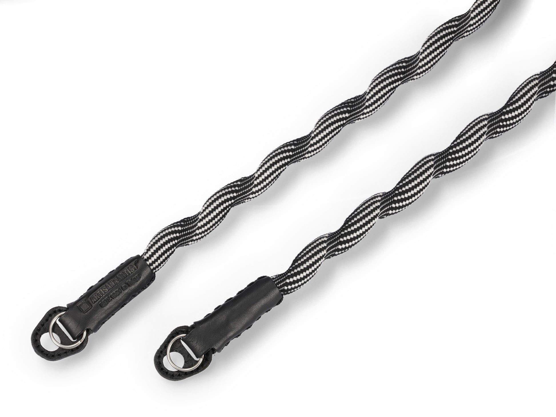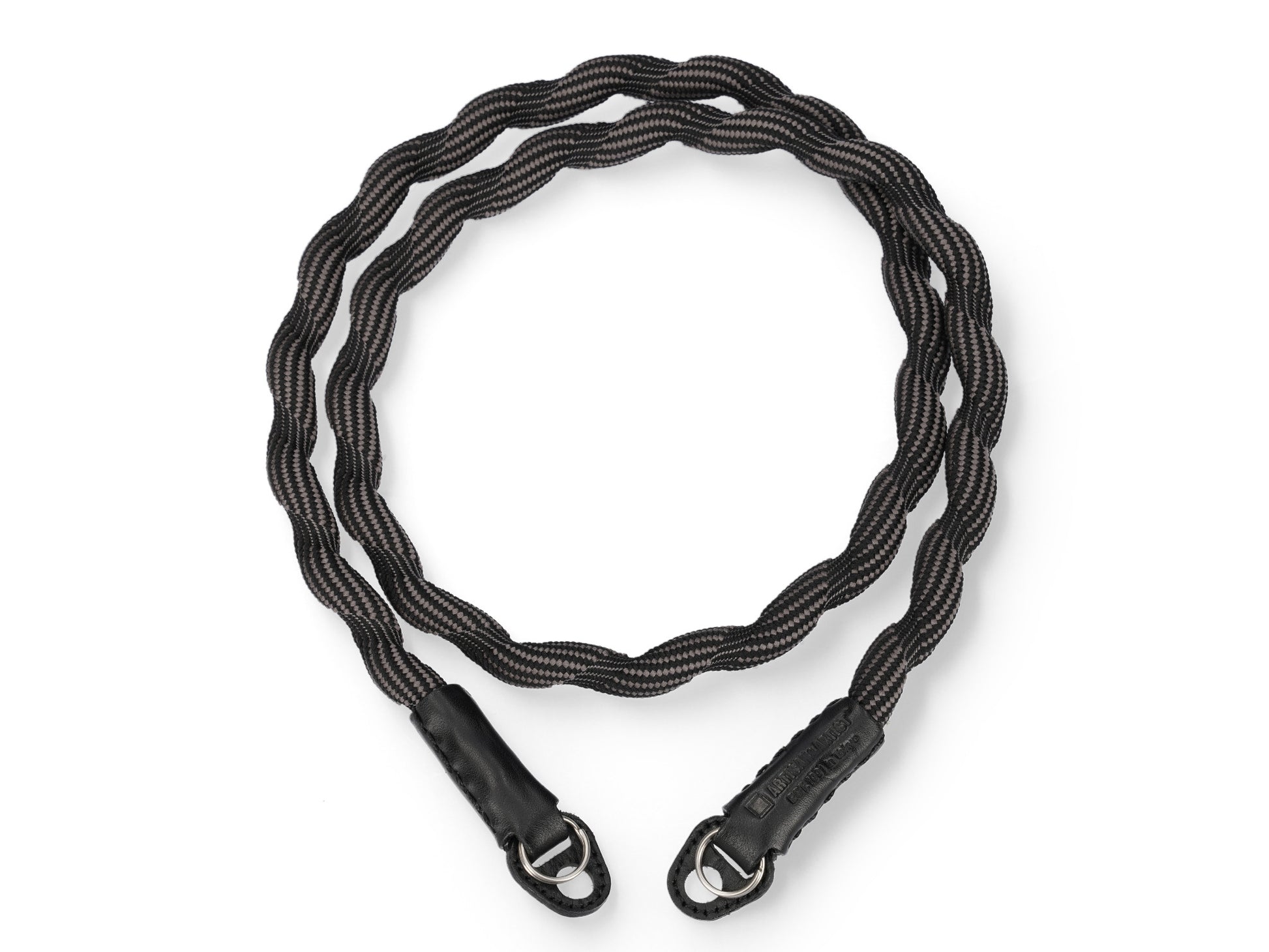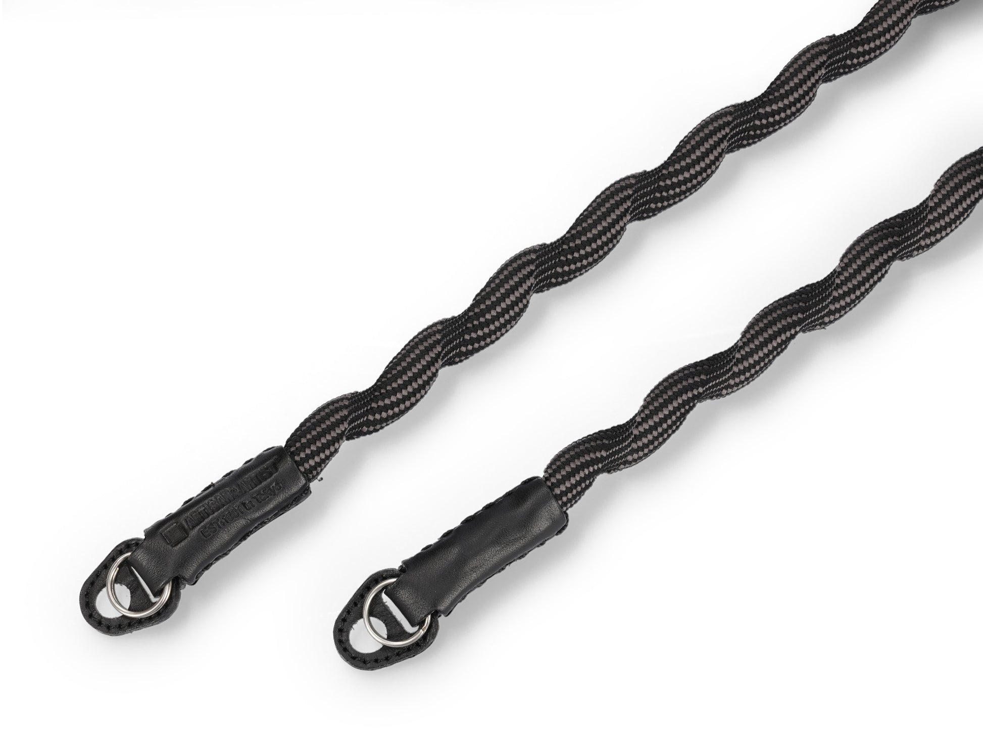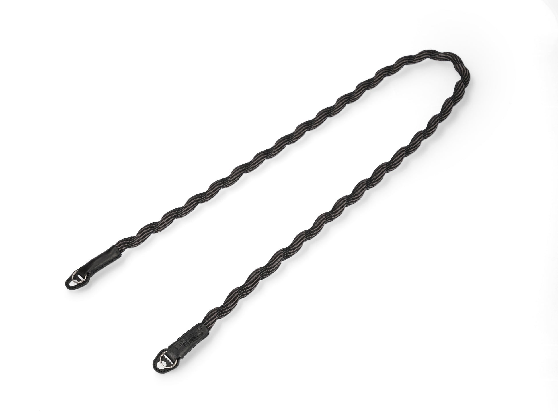 Spiralförmiger Kameragurt, hergestellt mit fortschrittlicher japanischer Webtechnik. Äußerst robust und leicht elastisch. Hoher Tragekomfort. Lässt sich auch einfach ums Handgelenk wickeln oder zur Längenanpassung verknoten. Gurtenden mit Schutzlaschen aus Leder. Ringbefestigung.