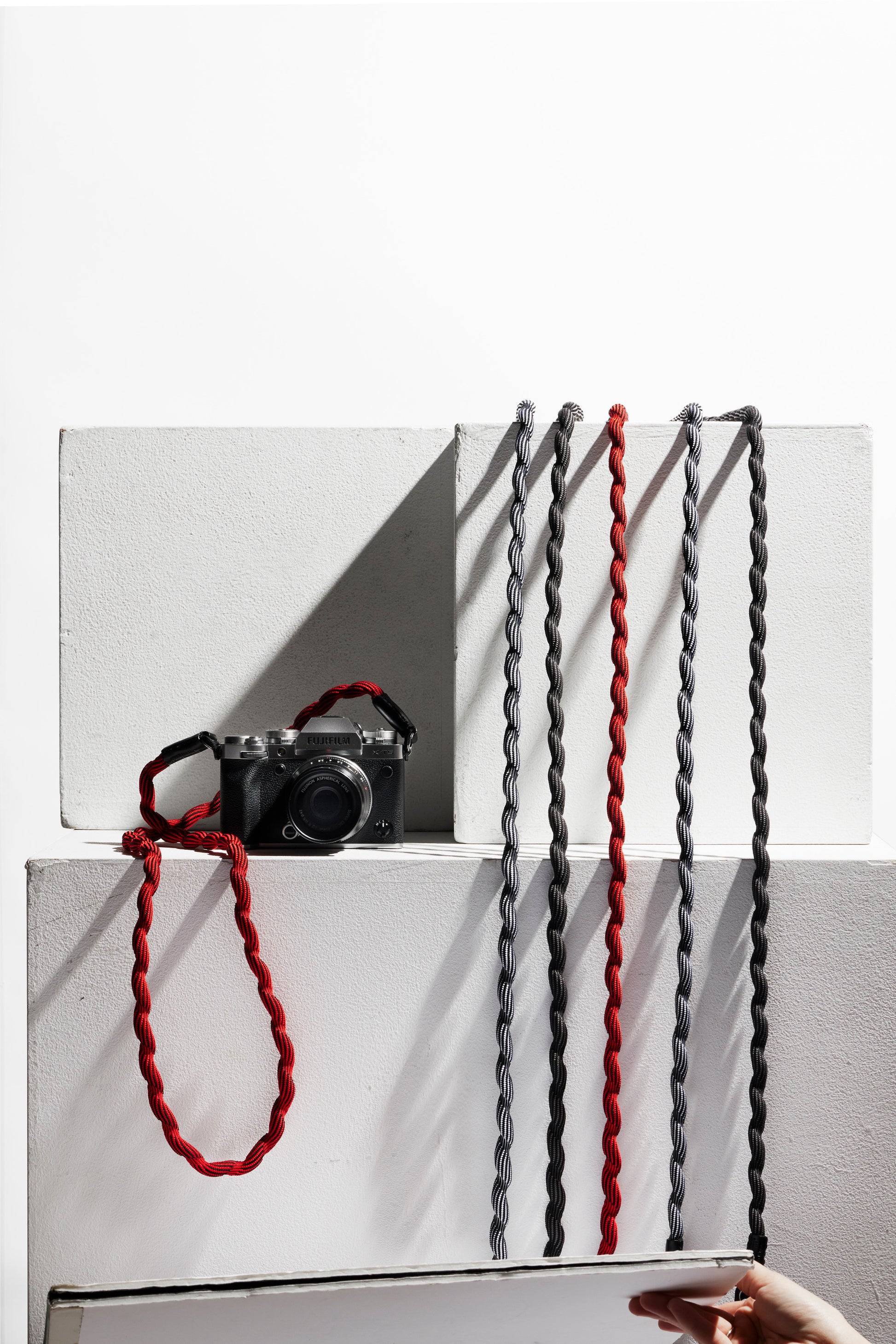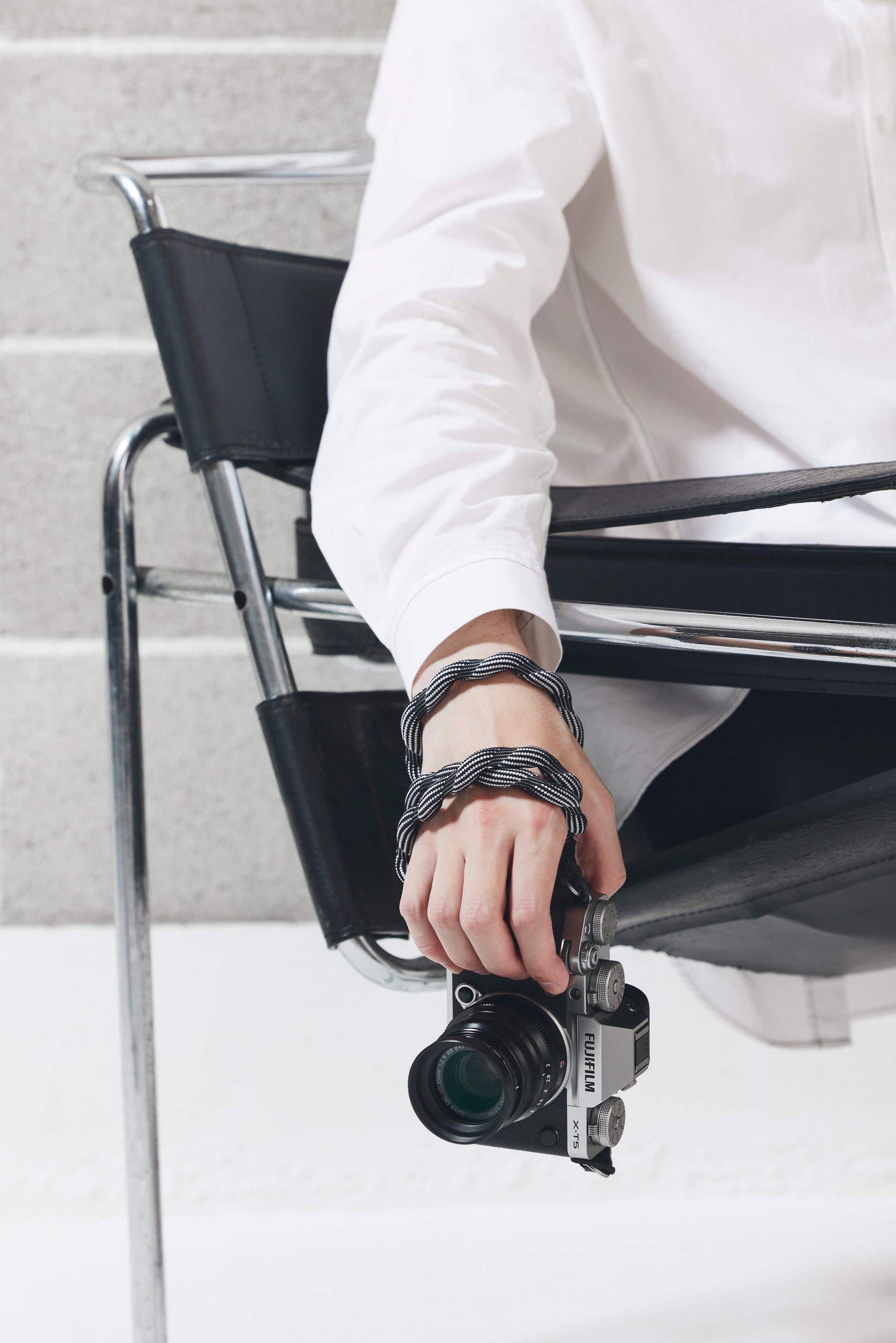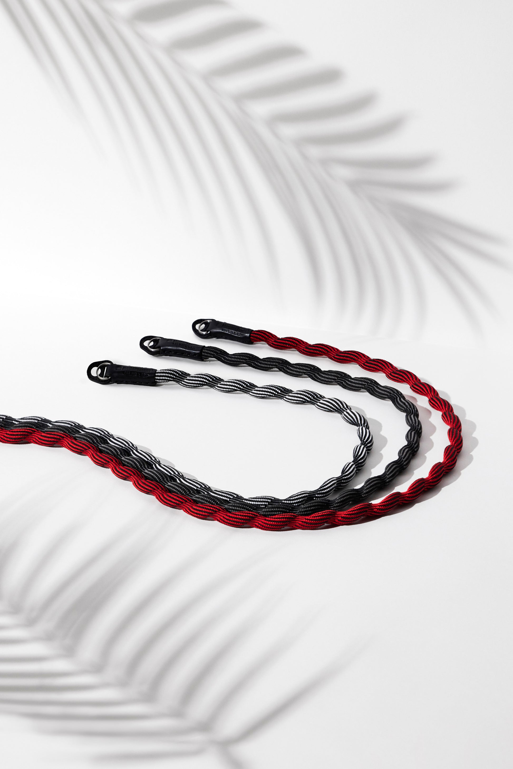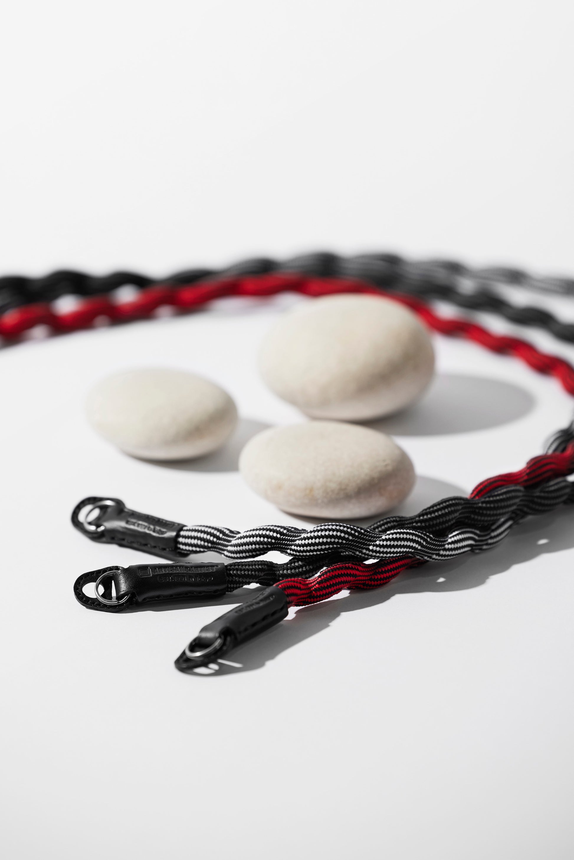 Spiralförmiger Kameragurt, hergestellt mit fortschrittlicher japanischer Webtechnik. Äußerst robust und leicht elastisch. Hoher Tragekomfort. Lässt sich auch einfach ums Handgelenk wickeln oder zur Längenanpassung verknoten. Gurtenden mit Schutzlaschen aus Leder. Ringbefestigung.