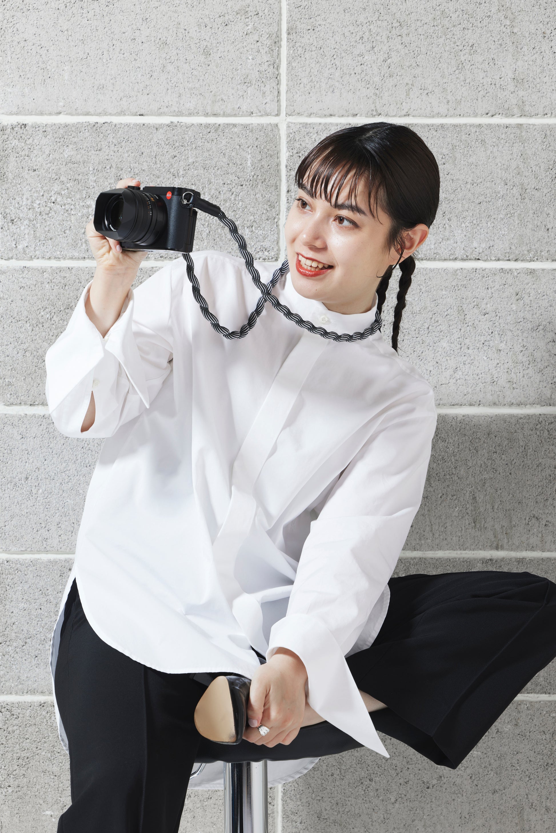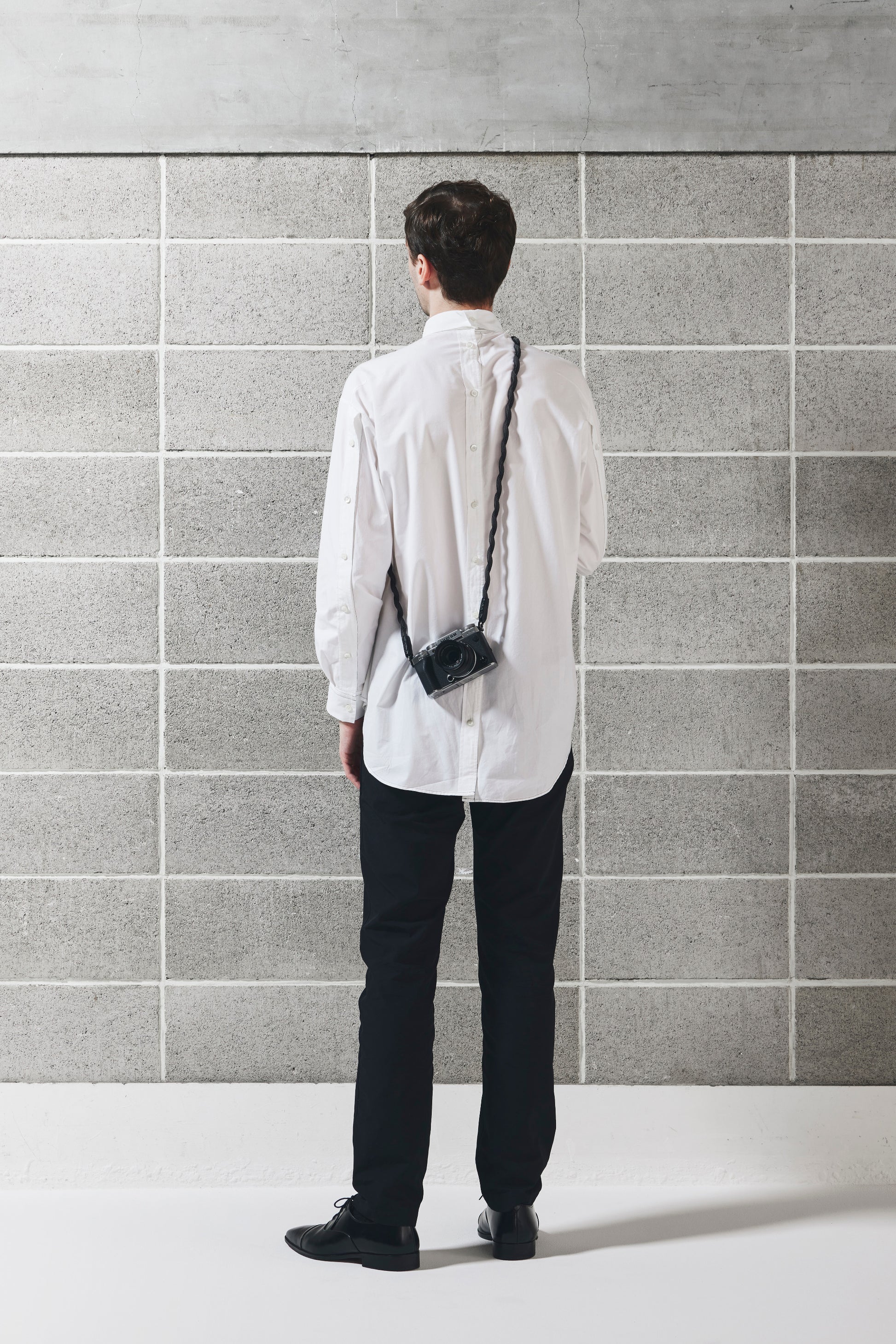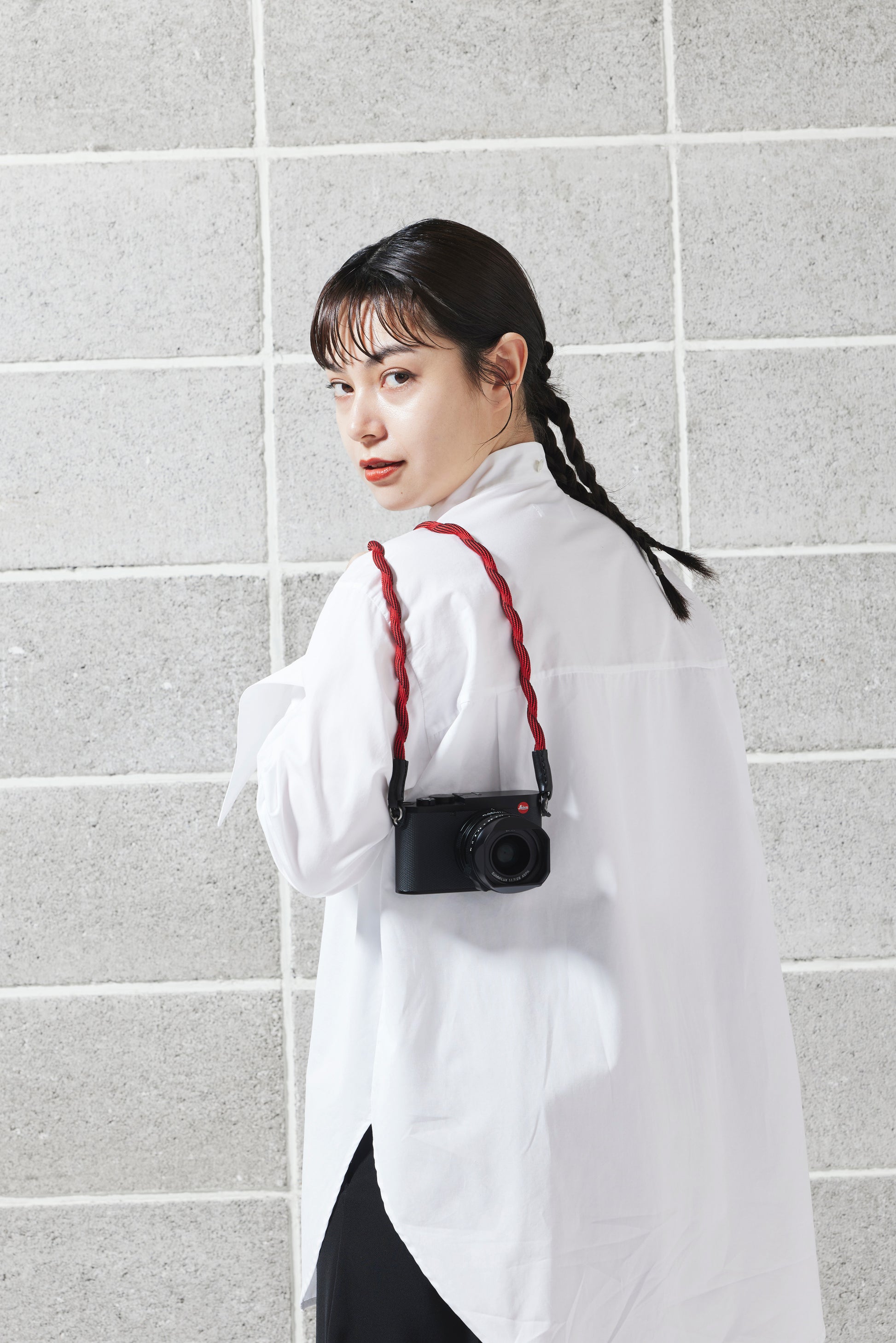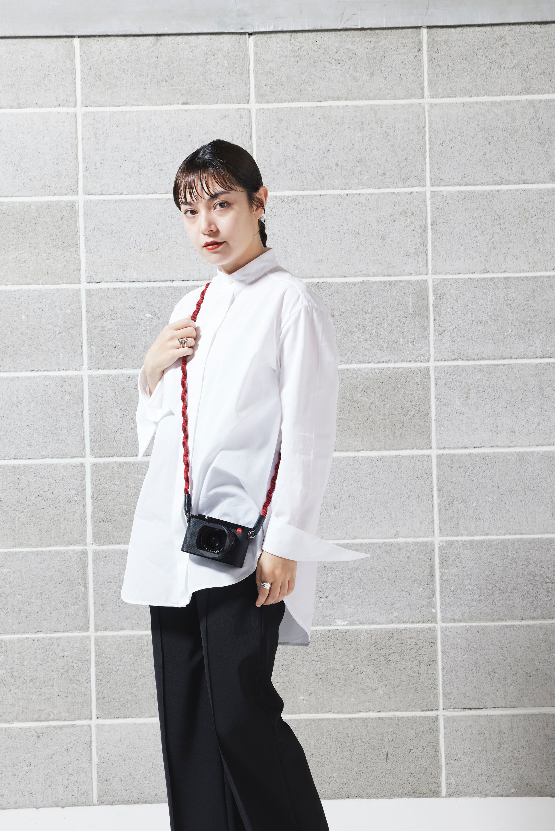Spiralförmiger Kameragurt, hergestellt mit fortschrittlicher japanischer Webtechnik. Äußerst robust und leicht elastisch. Hoher Tragekomfort. Lässt sich auch einfach ums Handgelenk wickeln oder zur Längenanpassung verknoten. Gurtenden mit Schutzlaschen aus Leder. Ringbefestigung.