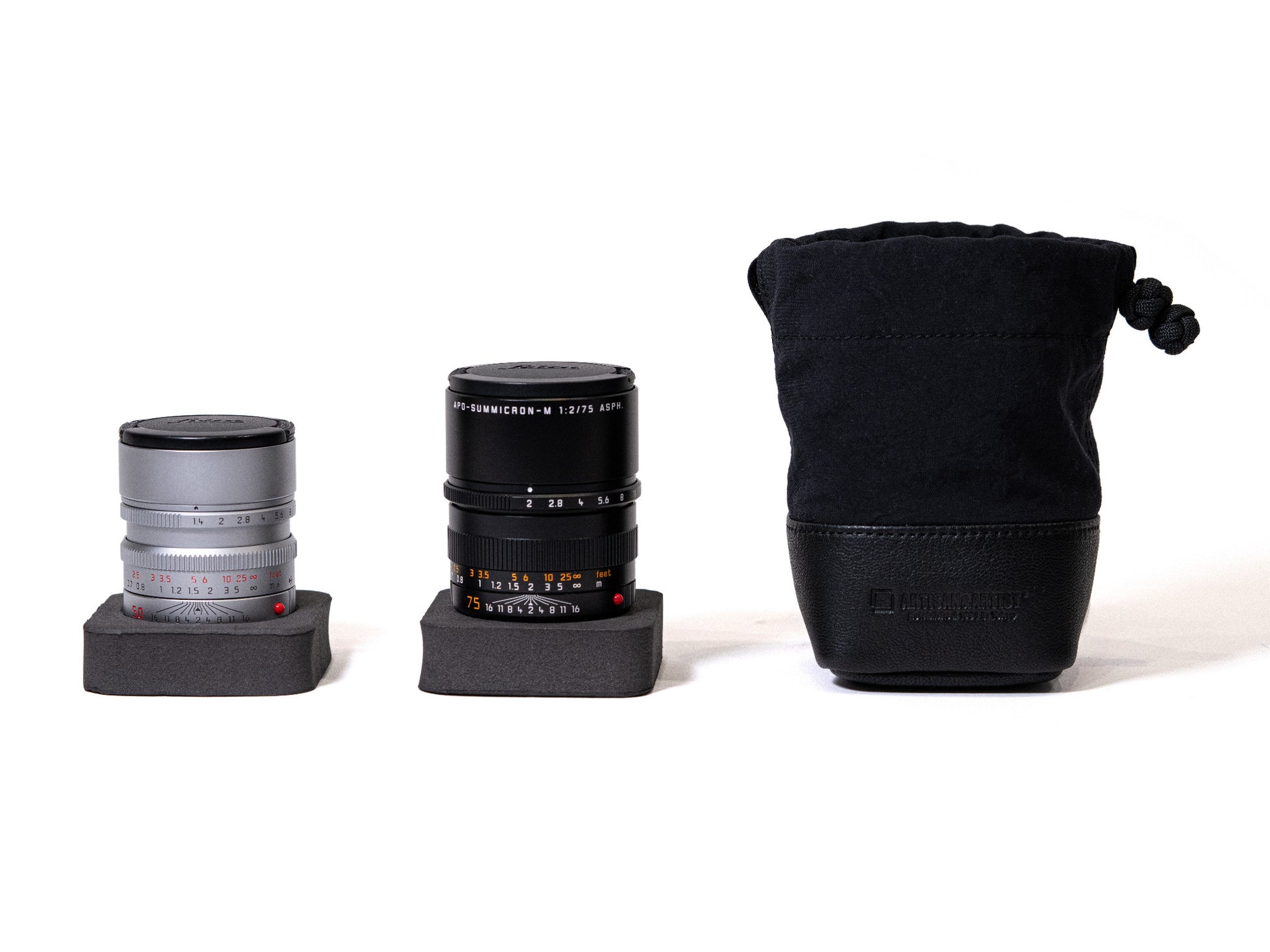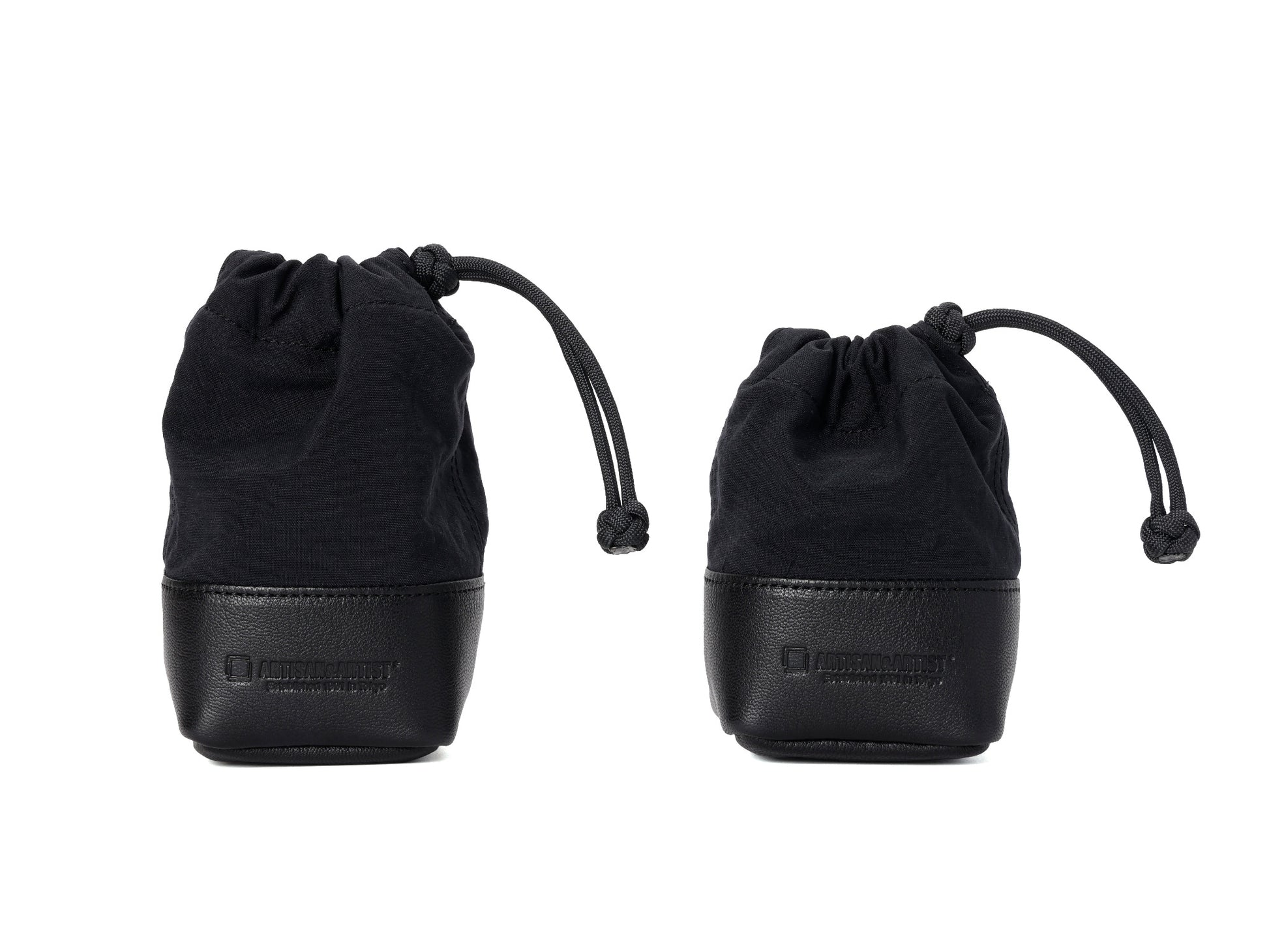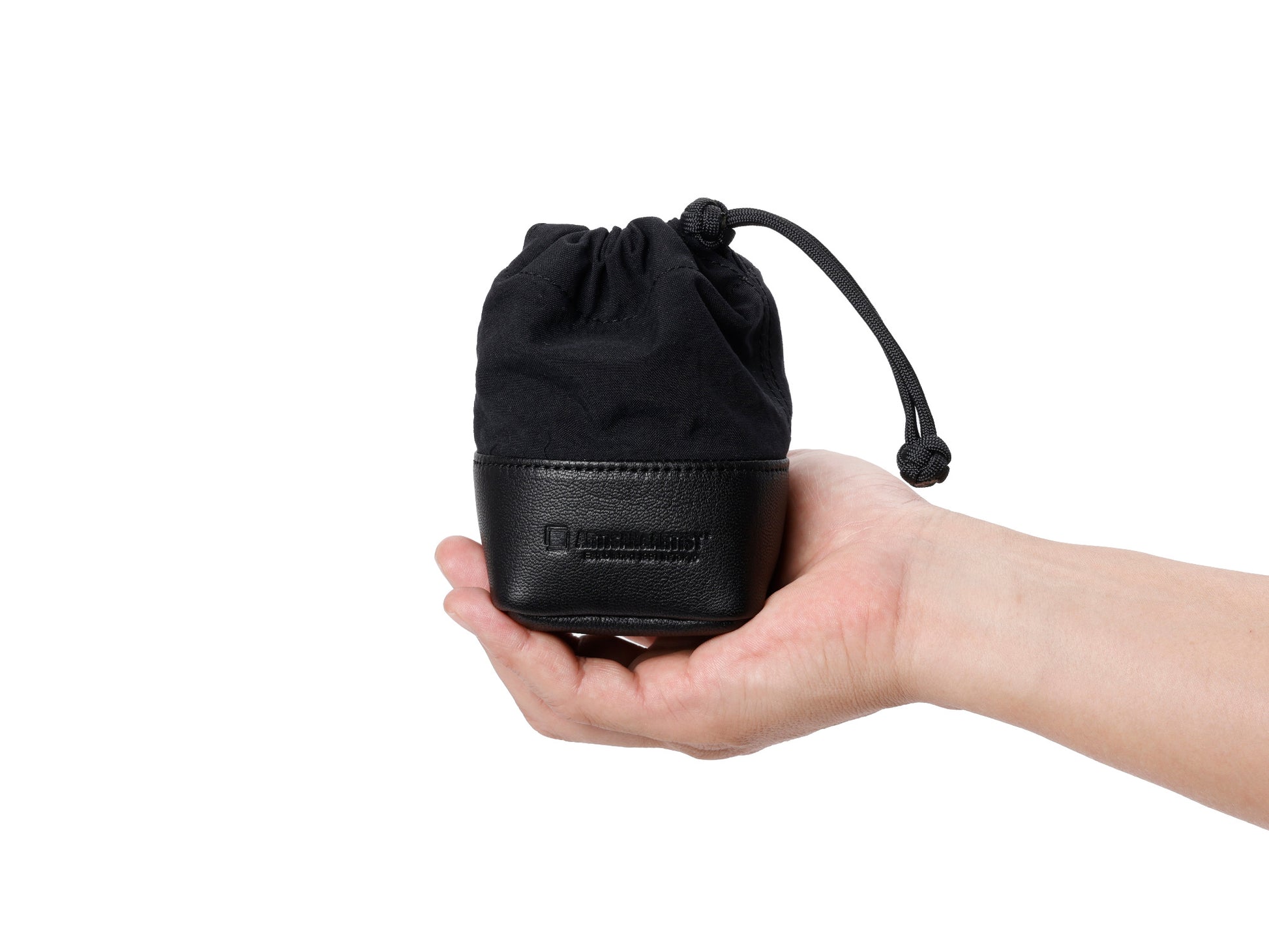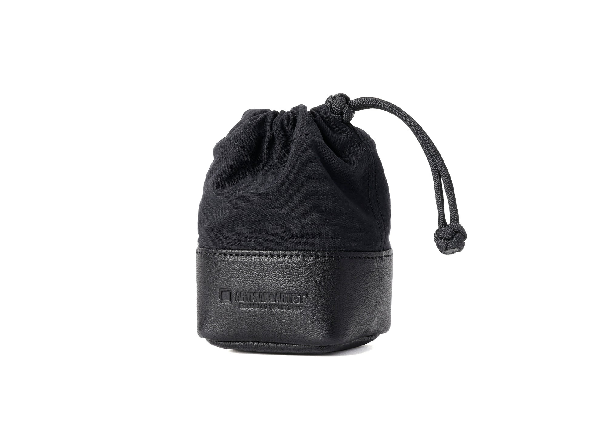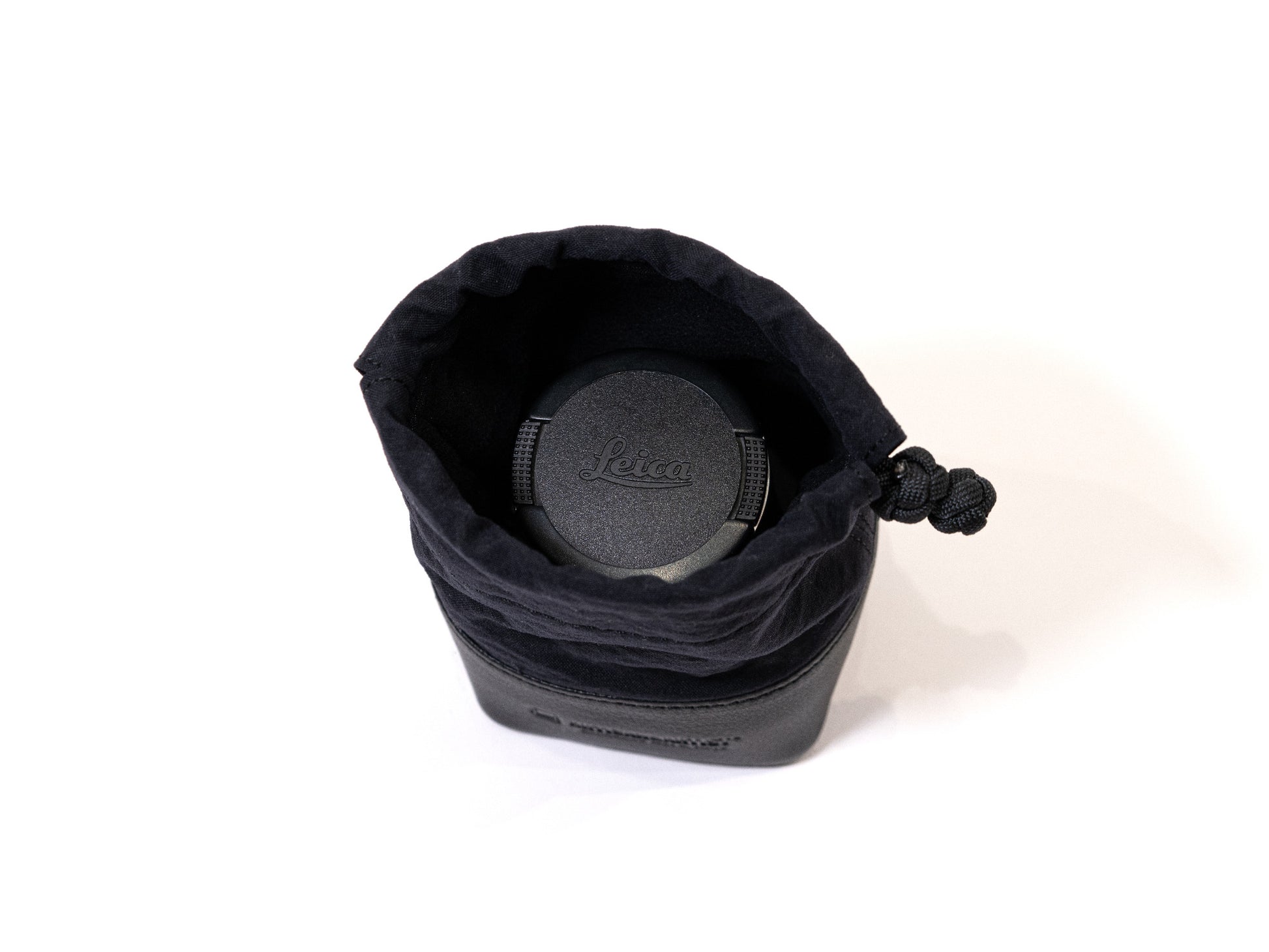 Hochwertiger, leichter Objektivschutzbeutel aus geschmeidigem und trotzdem formstabilem Ziegenleder mit natürlicher Narbung und hochdichtem baumwollartigem Nylon.
