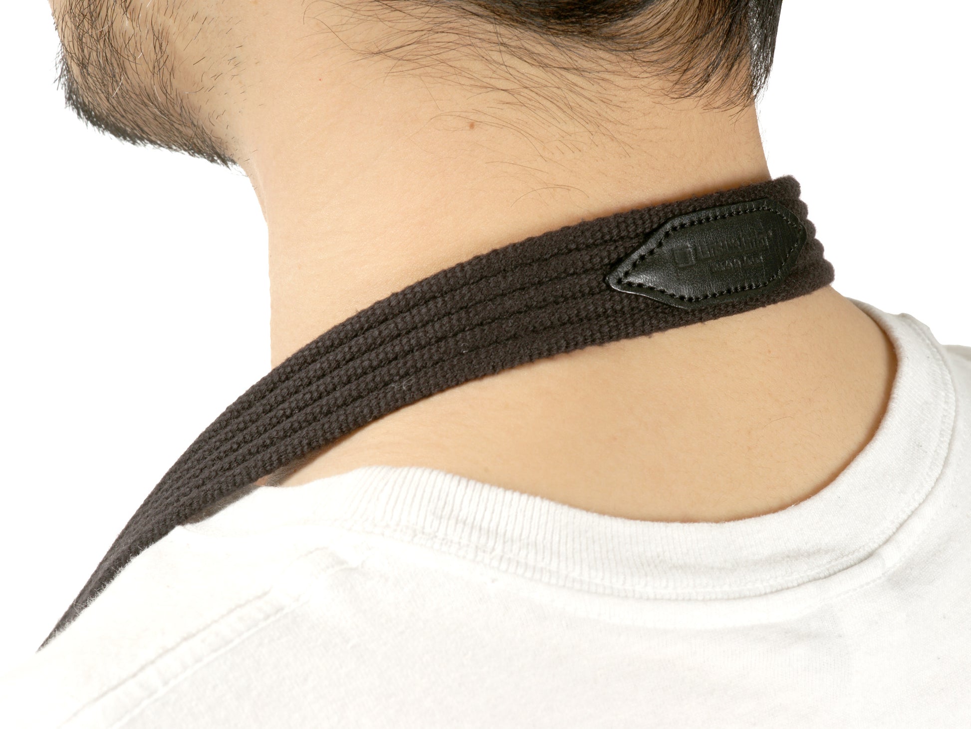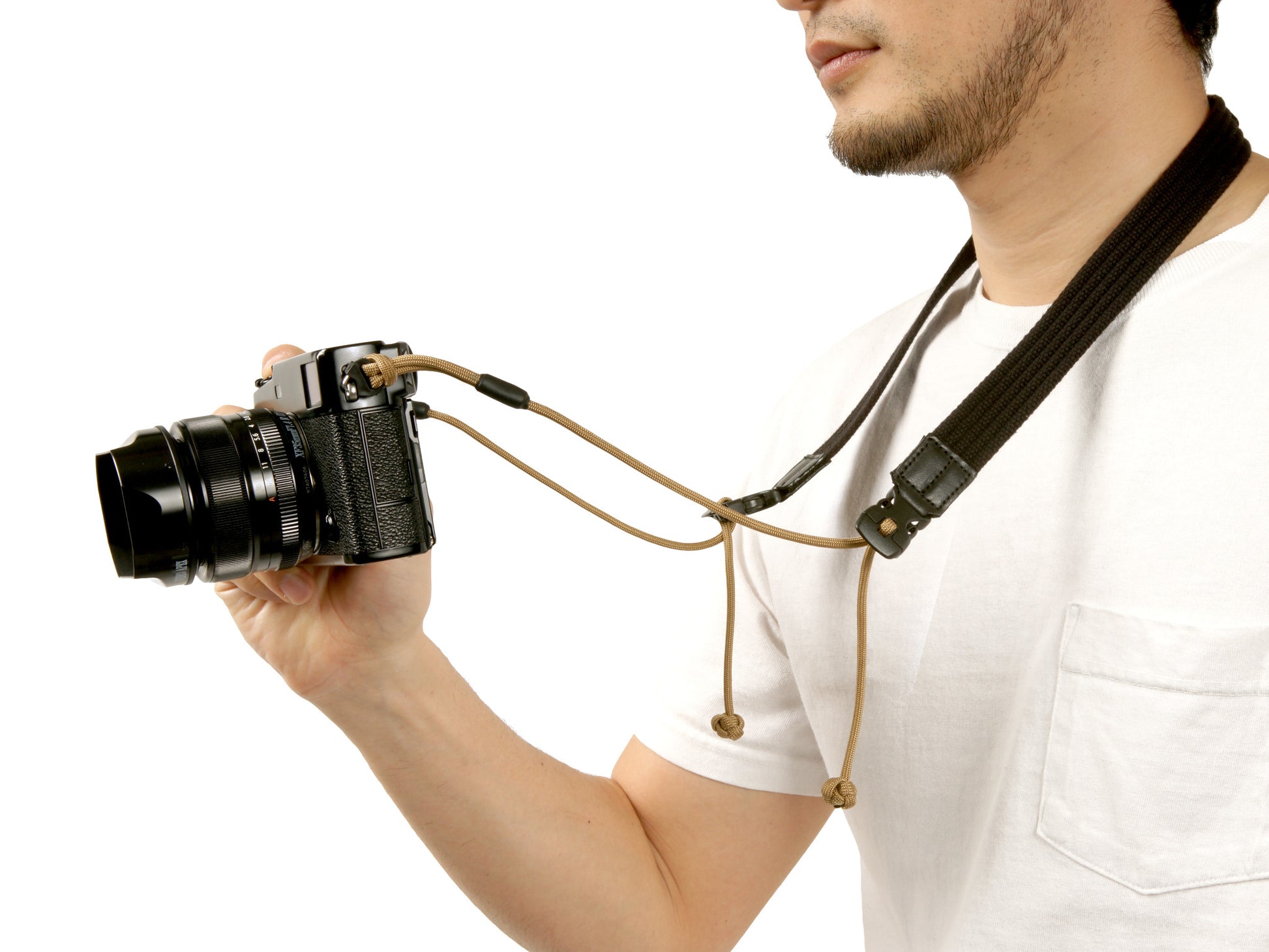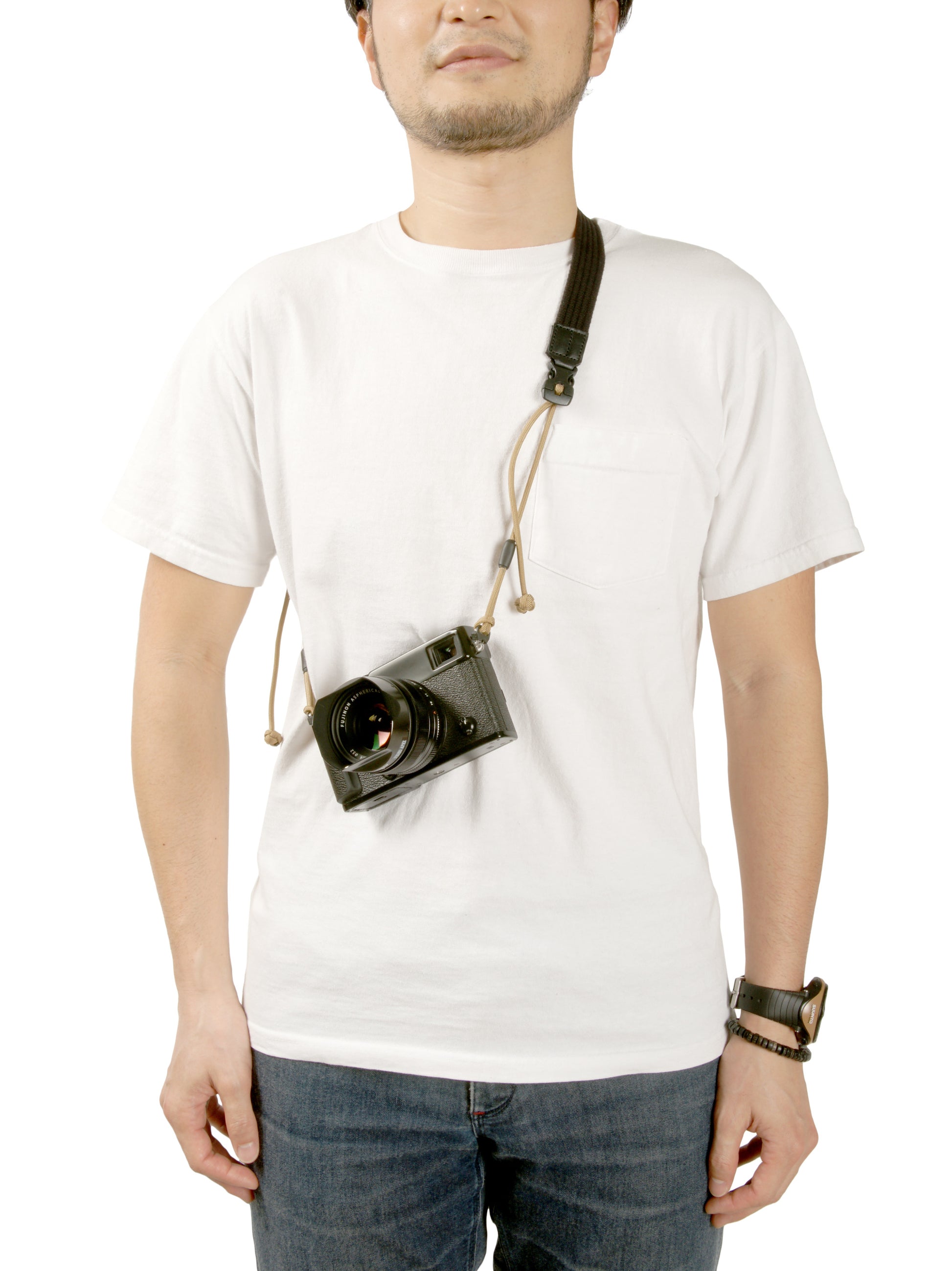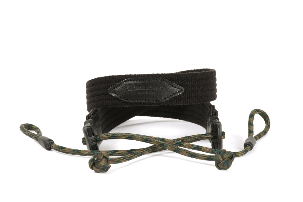Tragegurt für mittelgroße spiegellose Systemkameras oder DSLRs, bestehend aus einer Kombination von Paracord (Fallschirmseil), Stoff und Leder. Die Nacken- bzw. Schulterauflage besteht aus einem weichen Stoff, der nach einer traditionellen japanischen Webart hergestellt ist. Die kameraseitigen unteren Enden des Gurtes aus Paracord sind rechts uns links längenverstellbar. Beide enden in einem handgeknüpften „keltischen Knoten“, an dem sich das Seil zur Längenverstellung gut greifen lässt. Zum Befestigen an der Kamera lässt sich der Gurt über beidseitige Schnellverschlüsse problemlos öffnen. Beim Übergang von Schulterauflage zu den Schnellverschlüssen kommt hochwertiges, handvernähtes Leder zum Einsatz. Der Gurt ist geeignet für Kameras mit Schlaufen- bzw. Ringbefestigung. Dreiecksringe mit Kratzschutz sind im Lieferumfang.