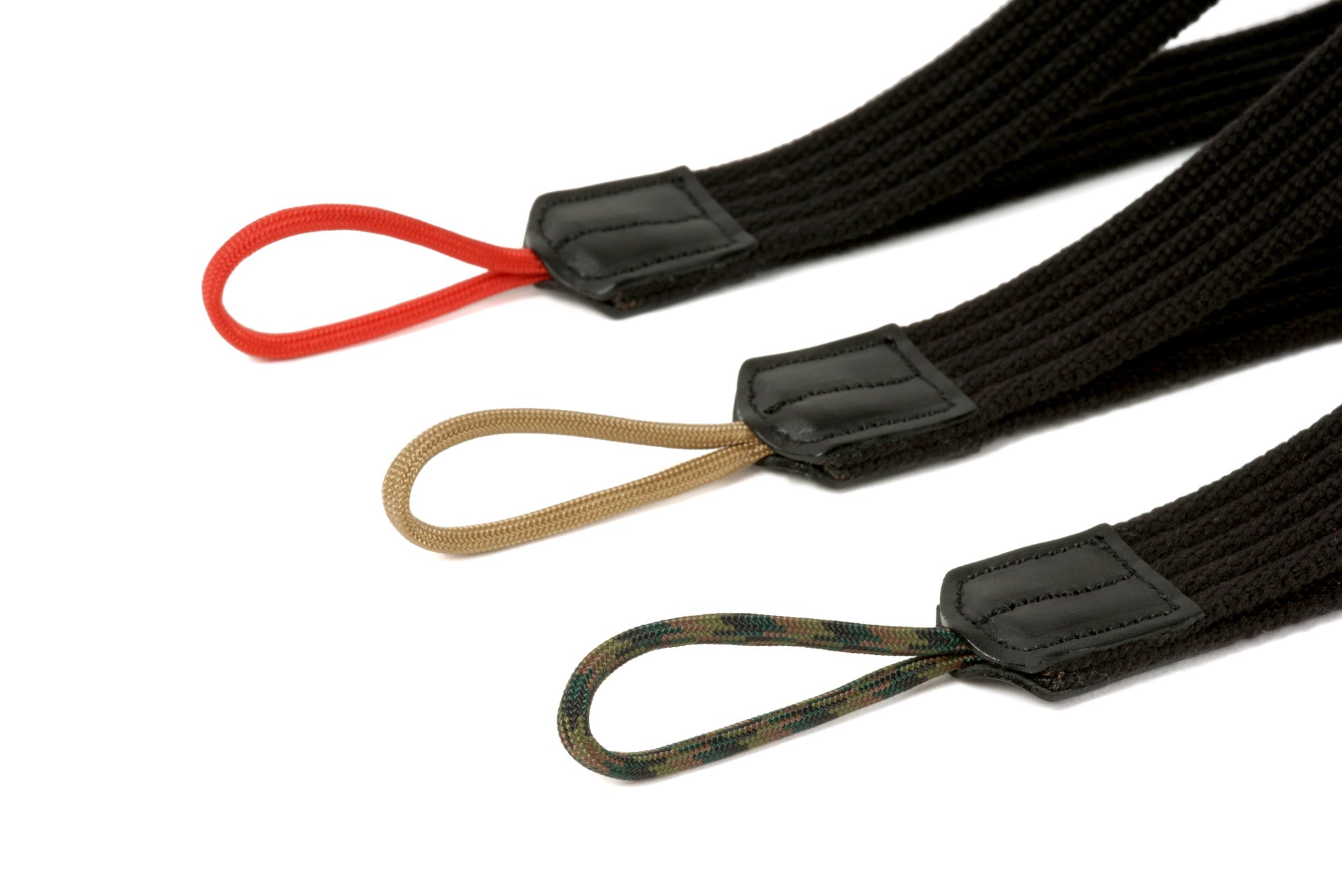 Kamera-Handschlaufe für mittelgroße spiegellose Systemkameras oder DSLRs, bestehend aus einer Kombination von Paracord (Fallschirmseil), Stoff und Leder. Die Handgelenkauflage besteht aus einem weichen Stoff, der nach einer traditionellen japanischen Webart hergestellt ist. Beim Übergang zum Fallschirmseil am unteren Ende der Handschlaufe kommt hochwertiges, handvernähtes Leder zum Einsatz. Die Handschlaufe ist geeignet für Kameras mit Schlaufen- bzw. Ringbefestigung. Ein Dreiecksring mit Kratzschutz ist im Lieferumfang.