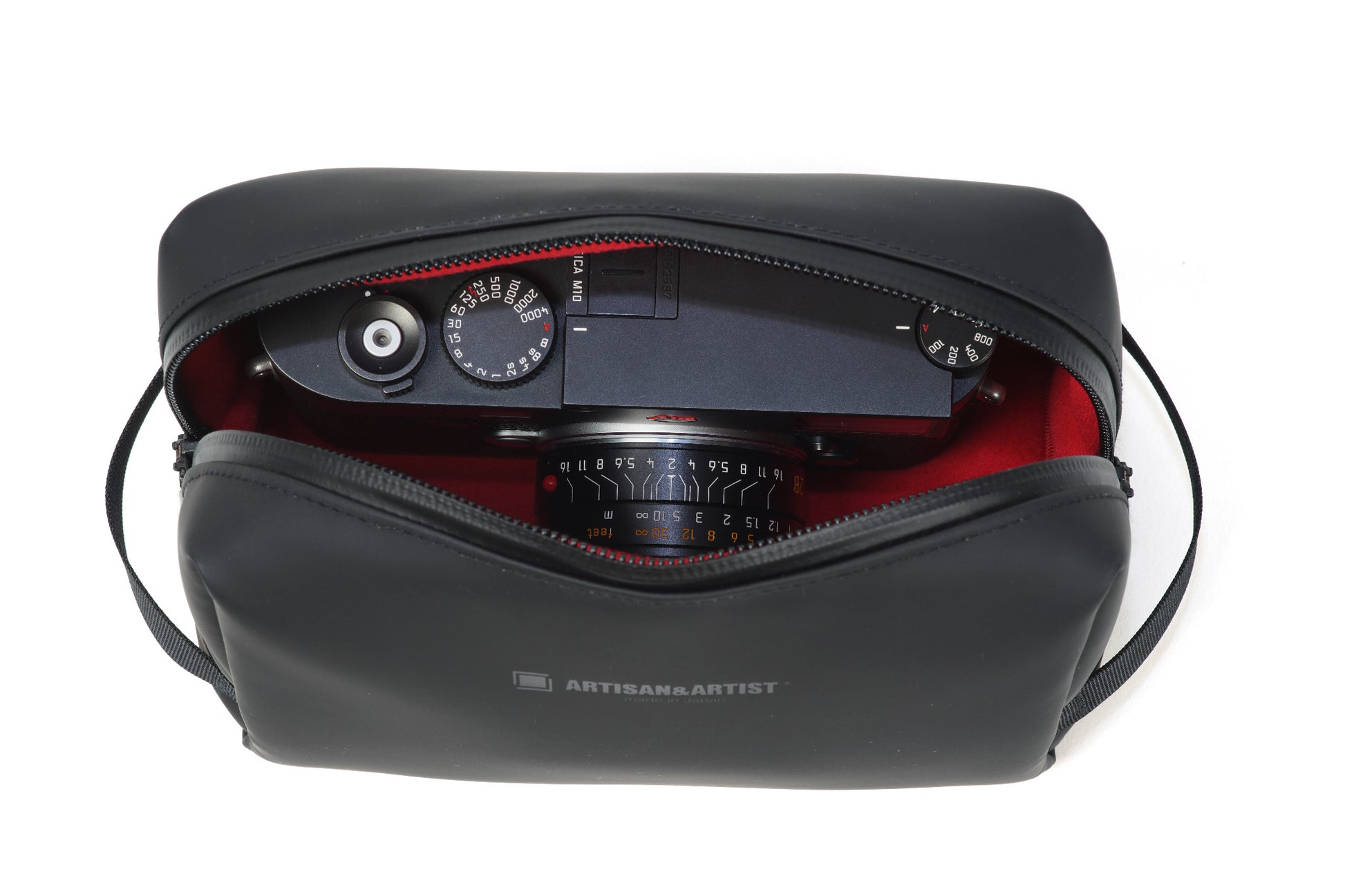 Hochwertige Kamera/Zubehör-Tasche mit Platz für ein Kameragehäuse (spiegellose Systemkamera oder Leica M) und ein angesetztes Objektiv. Außenmaterial , Reißverschluss und Schiebergriffe in elegantem Mattschwarz. Außenmaterial aus kratzfestem, wasserdichtem Polyurethan (DULON®). Wasser- und feuchtigkeitsbeständiger Reißverschluss mit fixierbaren Schiebergriffen. Mit zwei seitlichen Tragegriffen, aber auch ideal zur Unterbringung in größeren Foto- und Freizeittaschen oder im Reisegepäck. Samtartiges Innenfutter.
