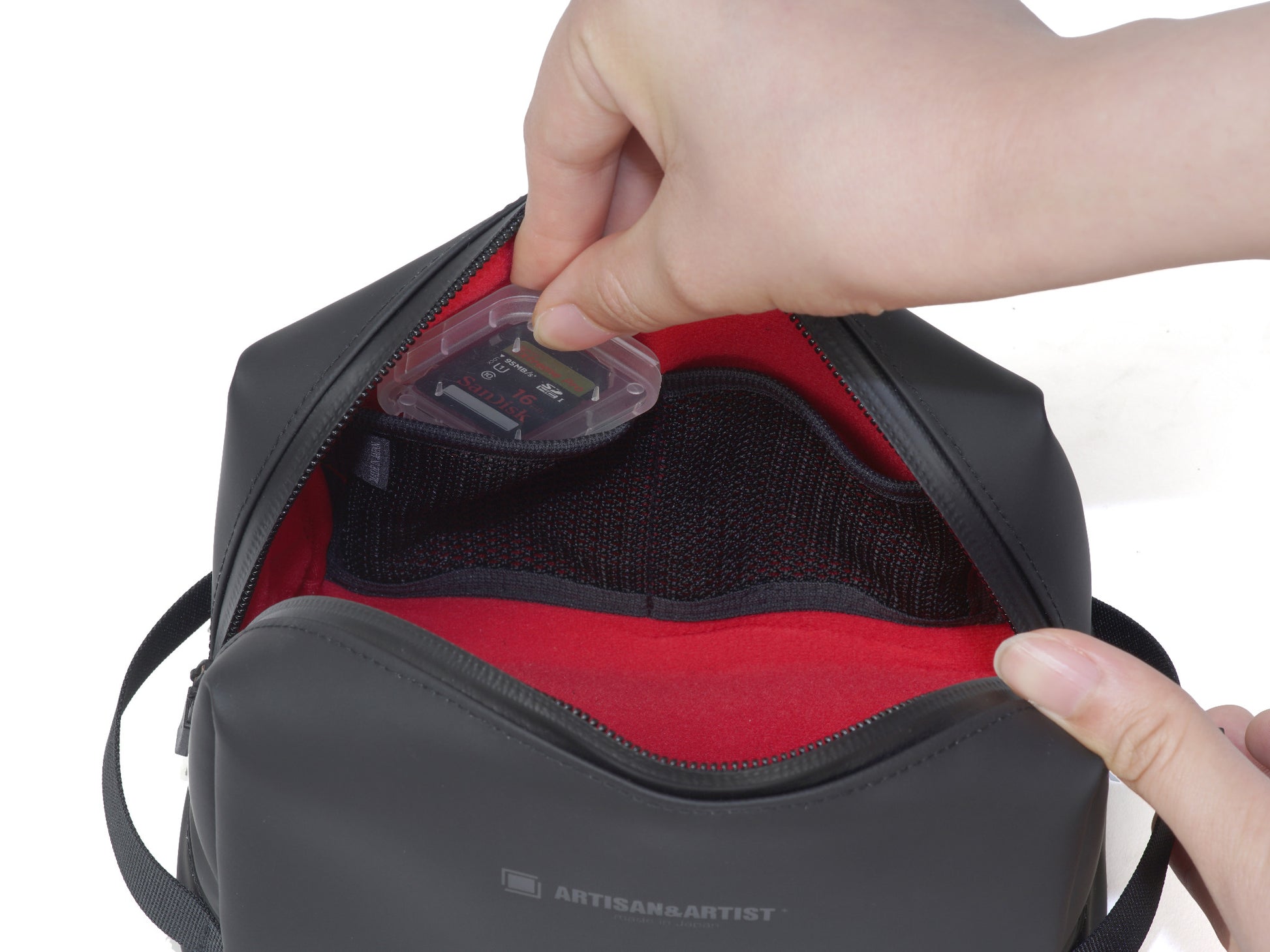 Zwei Netztaschen an der Innenseite für Kleinzubehör, Speicherkarten etc. Deckel mit 2-Wege-Reißverschluss für schnellen Zugriff. Adressfach an der Vorderseite.